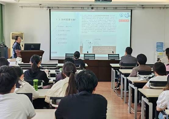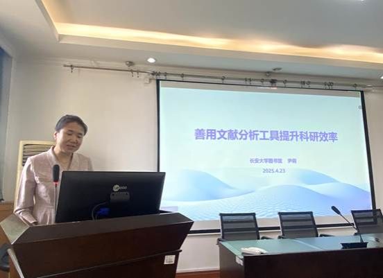 人文学院副院长杜波到场致辞并介绍本次讲座主要内容,本次讲座分为两场:第一场《书山寻径:图书馆数字资源服务与利用》由图书馆馆员张志惠为师生介绍长安大学图书馆人文社科特色数字资源的类型、检索与获取方式;第二场《善用文献分析工具提升科研效率》由图书馆研究馆员尹莉详细介绍AI科研辅助平台与工具、文献管理软件、文献计量可视化软件如何应用在学习科研中。