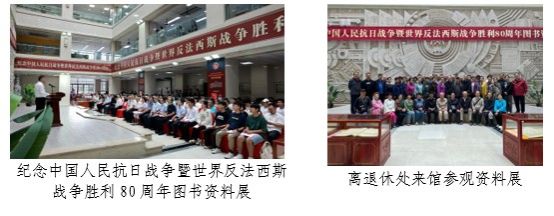 9月2日,联合机关党委、团委等单位在北校区图书馆举办纪念中国人民抗日战争暨世界反法西斯战争胜利80周年图书资料展开展仪式。校党委书记陈志坚、副校长范文出席,老同志代表、相关职能部门负责人及师生代表近200人参加。本次展览集中展出抗战主题图书800余册、1937至1945年刊发的报纸18册3000余份、历史照片500余幅及抗战歌曲、名人题词等资料,全景式、多维度再现抗战历史。9月19日,校离退休处组织老同志参观展览,馆员围绕五大主题,以原始报纸为重点进行细致讲解,让馆藏蕴含的革命精神“活起来”,引发老同志强烈共鸣,成为深化爱国主义教育的生动课堂,彰显了图书馆在传承红色文化、凝聚师生力量中的重要作用。