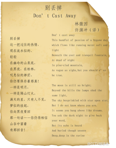 曾将《诗经》、《楚辞》、《唐诗》、《宋词》、《西厢记》、《牡丹亭》等中国文学名篇翻译成英语和法语,荣获国际翻译界最高奖项之一“北极光文学翻译奖”的96岁翻译家许渊冲追忆往事,他讲述了为追求女同学而翻译林徽因《别丢掉》的经历,动情之处一度热泪盈眶。近百岁高龄的他如今每天依然坚持工作,“翻译仍是生活的驱动力,每天能陪伴我工作到凌晨三四点”。