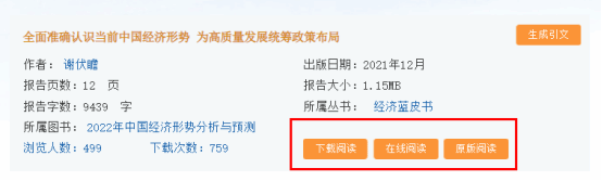 (6)世界经济与国际关系数据库:整合世界经济、国际政治、世界文化与科技、全球性问题、国际组织与国际法、区域研究6大领域研究成果,对世界经济形势、国际形势进行连续性深度分析,对年度热点问题进行专题解读,为研判全球发展趋势提供事实和数据支持。